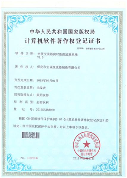 計算機軟件注冊權登記證書——光伏變流器實時數據檢測系統V1.0