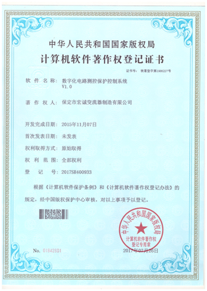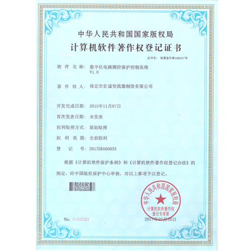 計算機軟件注冊權登記證書——數字化電路測控保護控制系統V1.0
