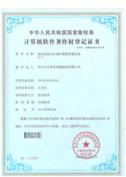 計算機軟件注冊權登記證書——整流電源過壓保護數據采集系統V1.0