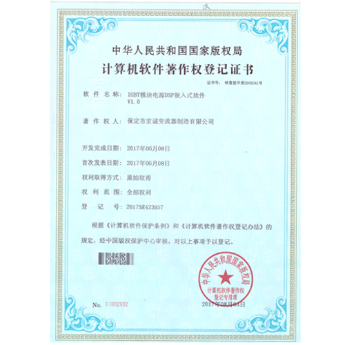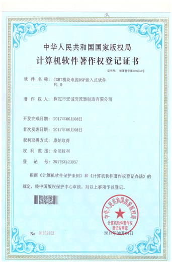 計算機軟件注冊權登記證書——IGBT模塊電源DSP嵌入式軟件V1.0