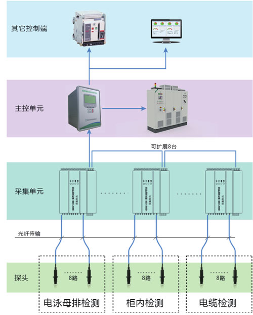 One main control unit can simultaneously protect several detection areas, so that the acquisition units of the arc light microcomputer monitoring system can be scattered to different locations totransmit the detected arc light signals to the main control unit.